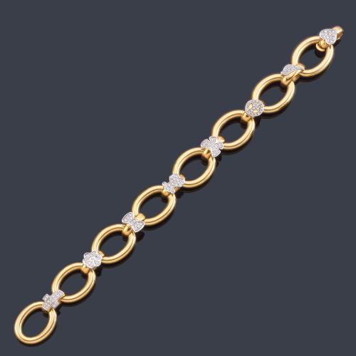 Pulsera con eslabones ovalados en oro amarillo de 18K intercalado con diferentes motivos cuajados de brillantitos.