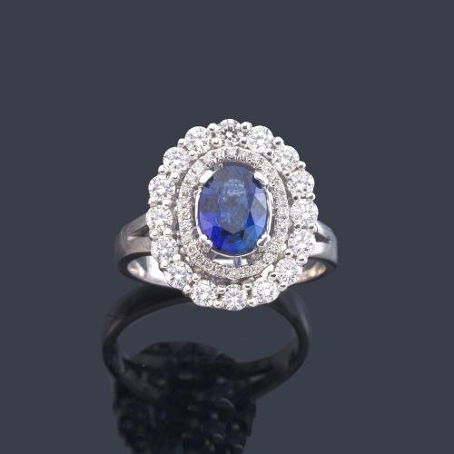 Anillo con zafiro talla oval de aprox. 1,35 ct y doble orla de brillantes de aprox. 0,90 ct en total.