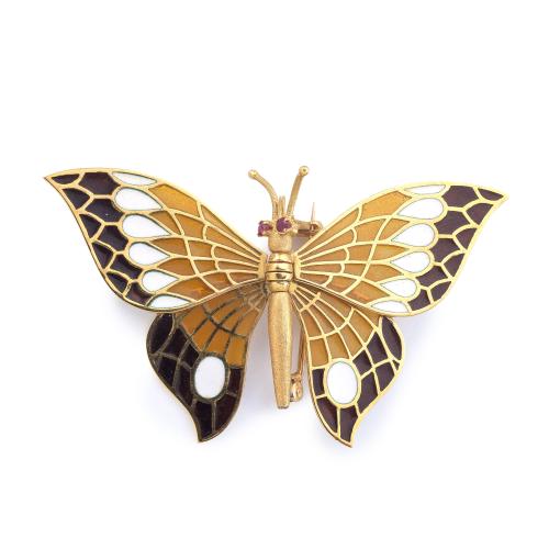 Broche en forma de mariposa con esmalte 'pliquè-a-jour' con esmalte policromado en montura de oro amarillo de 18K.