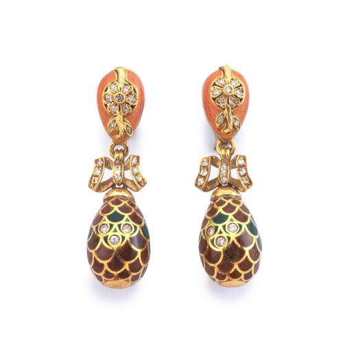 Pendientes largos con brillantes y esmalte policromado en montura de oro amarillo de 18K.