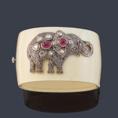 Pulsera ancha realizada en baquelita con motivo central en forma de elefante con pavé de diamantes talla rosa y dos rubíes talla cabujón en montura de plata.