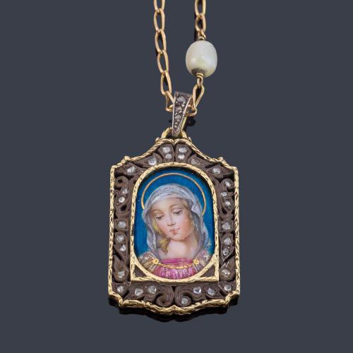 Lote 2392: Medalla devocional con La Imagen de La Virgen en esmalte policromado con orla de diamantes talla rosa, en montura de oro amarillo de 18K y vista en plata.