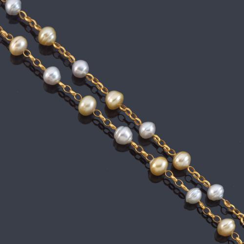 Collar largo con perlas barrocas golden y blancas con cadena en oro amarillo de 18K.