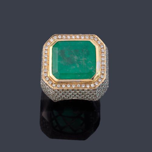 Anillo con gran esmeralda central de aprox. 18,00 ct sobre montura en pavé de brillantes de aprox. 7,00 ct en total.