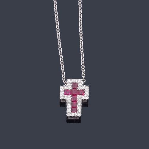Cruz con rubíes calibrados de aprox. 0,18 ct y orla de brillantes de aprox. 0,09 ct en total.