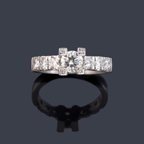 Lote 2452: Anillo con brillante central de aprox. 0,70 ct con banda de diamantes en ambos lados.