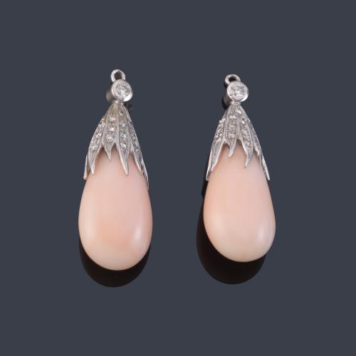 Doble remate para pendientes con pareja de chupones de coral 'piel de ángel' con copete cuajado de brillantes.