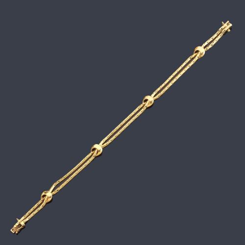 Pulsera con doble banda de eslabones articulados con cuatro motivos en forma de media luna.