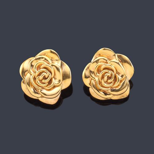 Pendientes cortos con diseño de rosas en montura de oro amarillo de 18K.