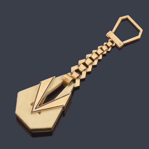 Llavero con pieza de diseño geométrico en montura de oro amarillo de 18K y detalle de esmalte negro. Años '70.