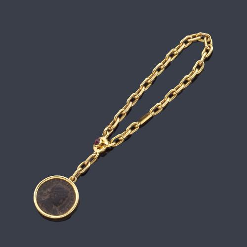 Llavero con moneda romana antigua realizado en oro amarillo de 18K y remate de rubí en cabujón.