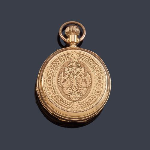 Esfera blanca con numeración romana, agujas tipo rombo y segundero a las 6. Caja en oro rosa de 18 K. Mecanismo de cuerda remontoire. Estado de marcha.