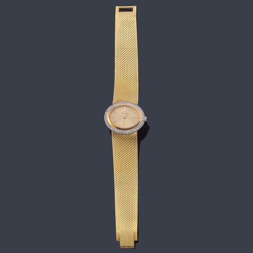Esfera dorada con numeración a trazos aplicados y agujas tipo bastón. Caja y brazalete en oro amarillo de 18 K con orla de brillantes. Mecanismo de cuerda. Estado de marcha.