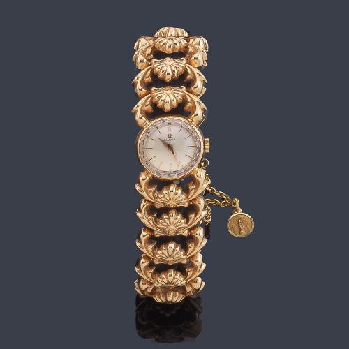 Presenta esfera argenté con numeración a trazos y agujas en espada, con caja en oro amarillo de 18K. Correa con eslabones articulados gallonados y motivos vegetales en oro amarillo y pequeña medalla de La Virgen del Pilar. Mecanismo de cuerda. En estado de marcha.
