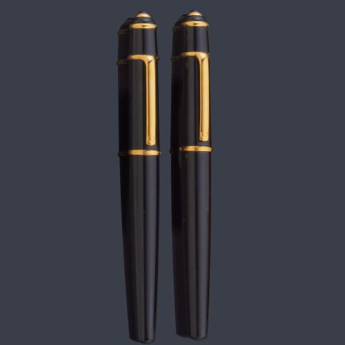 Cuerpo y capuchón en resina color negra Cabuchón de zafiro. Plumín de punto medio en oro blanco de 18 K. Carga por cartuchos. En funcionamiento.