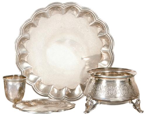 Lote formado por pequeño recipiente de plata holandesa punzonada S. XIX, salvilla ondulada de plata española de López y palmatoria de plata española punzonada 1ª Ley de López con platillo ondulado