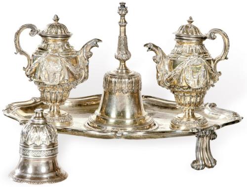 Bandeja de borde onduado con escudo grabado, con patas rematadas en voluta sobre la que se apoyan dos jarras con decoración de personajes en el proceso de fabricación del vino en cartelas ovales con drapperies y bajo los vertederos personajes con doble cola de pez. En el centro una campana e incluye otra rota.