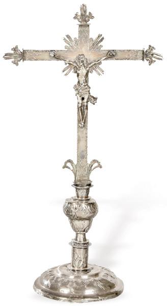 Cruz de altar con Cristo Crucificado de plata posiblemente española con punzón no identificado S. XVII-XVIII.