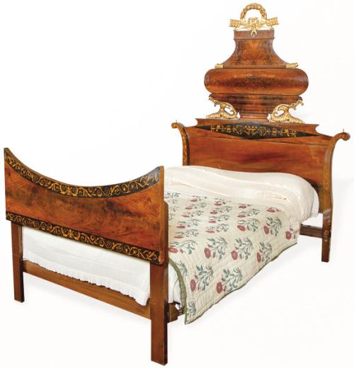 Lote 116: Cama fernandina en madera de caoba y palma de caoba con decoración vegetal en marquetería de limoncillo. Rematada con talla de madera de pino con detalles dorados.