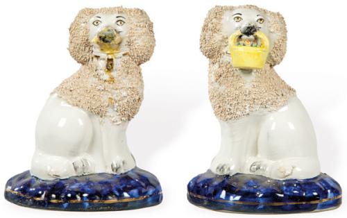 Lote 165: Pareja de figuras de Staffordshire Poodles en cerámica (uno de ellos sin cesta).