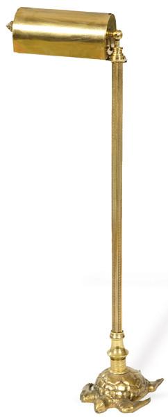 Lámpara de pie de bronce con pantalla tipo plafón y base en forma de tortuga.