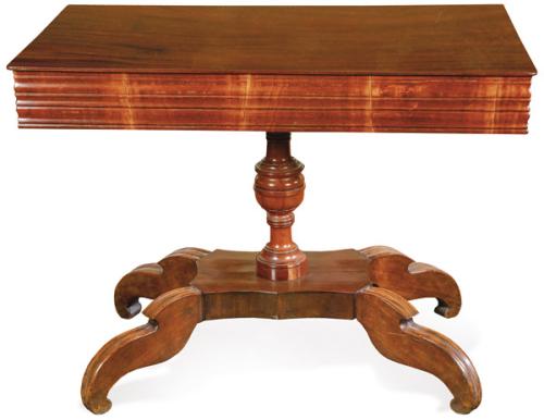 Mesa isabelina de tapa cuadrada con cintura moldurada sobre pedestal de torneado abalaustrado sobre plataforma sustentada por patas recortadas. España, mediados del s.XIX.