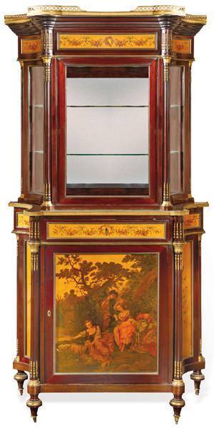 Cabinet Napoleón III estilo Luis XVI en madera de caoba. Cuerpo superior a modo de vitrina. Cuerpo inferior con decoración Vernis Martin con escena bucólica. Aplicaciones en latón. Francia, finales del sigl XIX.