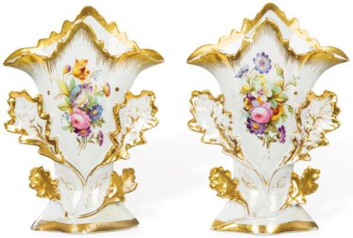 Pareja de jarrones viejo París esmaltads en blanco con decoración de flores y hojas parcialmente doradas. Uno de ellos restaurado. Francia, finales del siglo XIX.