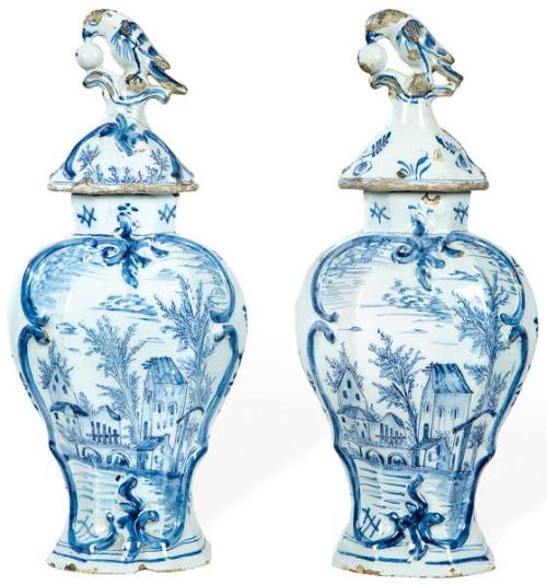 Pareja de tibores en cerámica moldeada y esmaltada de Delft. Moldeado con cartuchos de volutas que reservan paneles pintados con escenas campestres y tapas de balauster octogonales rematadas por figuras de pájaros (uno de ellos restaurado). Con marca en la base JVOH. Holanda, siglo XVIII
