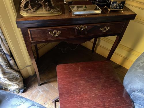 Mesa de juego en madera de palisandro, caoba y maderas frutales. Estilo Transición. Tapa con decoración de damero en marquetería sobre un cajón fileteado en limoncillo y tiradores y escudos de cerradura en latón. Finales del siglo XIX.