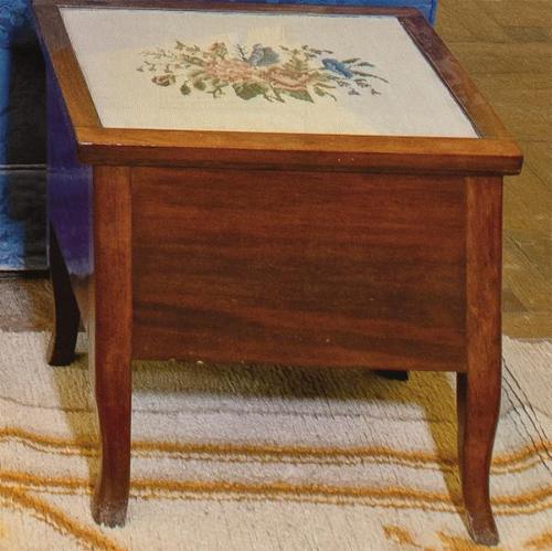 Lote 239: Mesa auxiliar en madera de caoba con tapa abatible en grosspoint de flores. Con compartimento interno. Siglo XX.