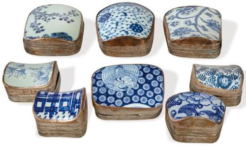 Ocho cajas chinas de cobre y porcelana azul y blanca. Pps. S.XX