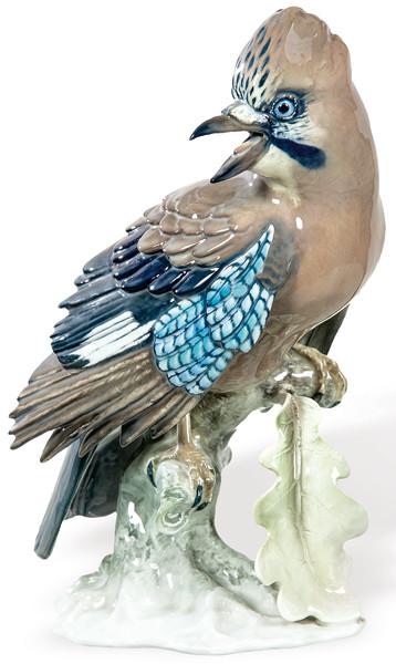 Pájaro, arrendajo común, sobre rama de roble en porcelana pintada y esmaltada de Rosenthal. Siglo XX.