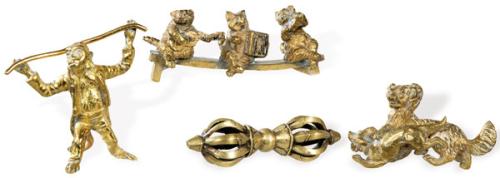 Lote formado por cuatro figuras en bronce: tres gatos musicos, mono con pertiga, perros luchando y un dorje.
