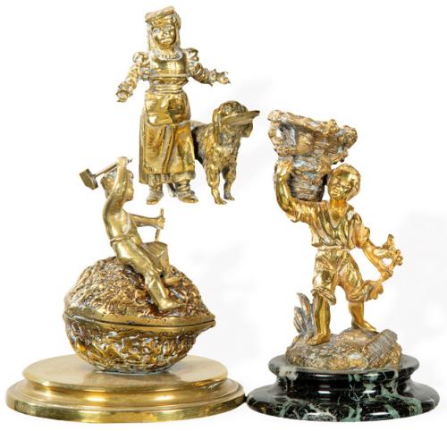 Lote 264: Tres pequeñas figuras de bronce dorado, niño con cesto, caja en forma de nuez con niño sobre ella y niño con perro.