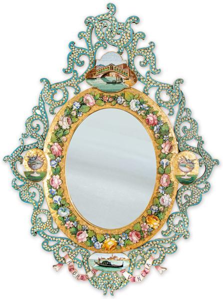 Con estructura calada a modo de ramas entrelazadas que rodean un marco ovalado decorado con guirnaldas de flores de pequeñas teselas de colores sobre un fondo dorado. A cada uno de los lados un bebedero de pájaros. En la parte superior sobresale una escena del Puente de Rialto y en el inferior un gondelero en el Gran Canal, y una cinta enlazada en la que se lee: RICORDO DI VENEZIA.