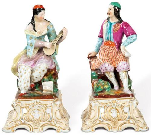 Lote 369: Pareja de botellas aromática al estilo de Jacob Petit con forma de dos figuras de griegos tradicionales en porcelana policromada y parcialmente dorada. Finales del siglo XIX.