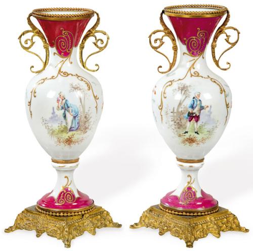 Pareja de floreros en porcelana esmaltada en blanco y granate con escena galante y motivos florales. Con montura de latón. Finales del siglo XIX.