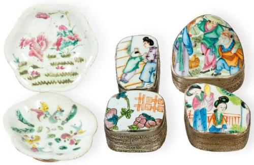Cuatro cajas de porcelana china, con esmaltes policromos y laton y dos pequeños recipientes de porcelana china con esmaltes polícromos, Dinastía Qing S. XIX.