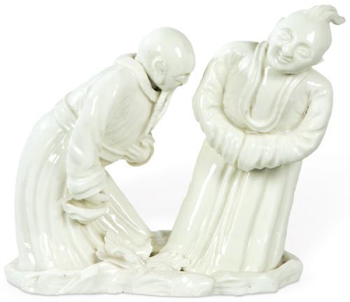 Lote 379: Grupo escultórico "Pareja de Monjes" en porcelana estilo "Blanco de China"
