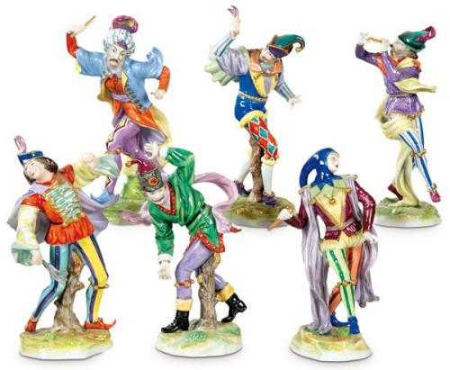 Lote 381: Conjunto de 6 bufones danzantes en porcelana con marca en la base de Volkstedt. Modelados por Gustav Oppel. Primera mitad del siglo XX.