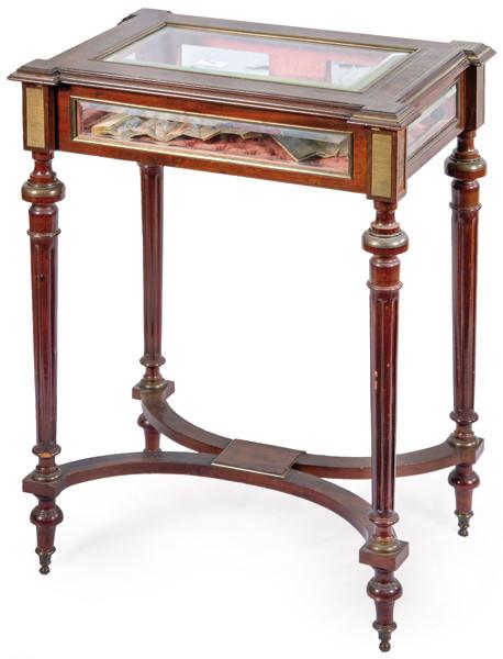 Lote 382: Mesa expositor Napoleón III estilo Luis XVI en madera de caoba con tapa abatible de cristal y monturas en bronce