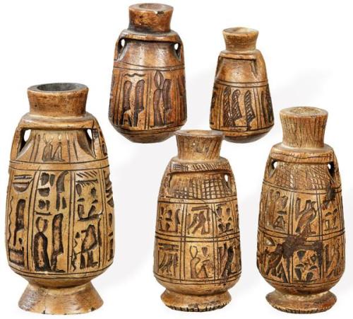 Cinco pequeños botes egipcios de alabastro tallado con decoracion de jeroglificos.