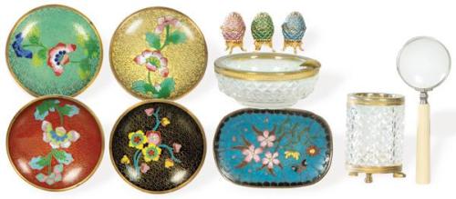 Lote 390: Lote formado por: 4 ceniceros chinos de esmalte cloisonné, cuatro circulares y uno ovalado, juego de fumador de cristal tallado y bronce, tres huevos caja de esmalte y bronce y una lupa con mango de hueso.