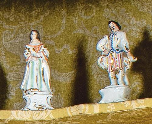 Pareja de figuras galantes "viejo París" esmaltadas en blanco y dorado.