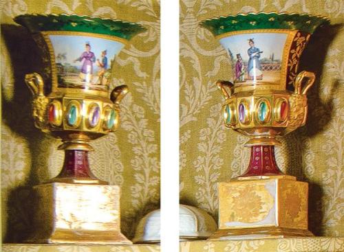 Pareja de copas en cerámica decoradas con escenas chinescas.