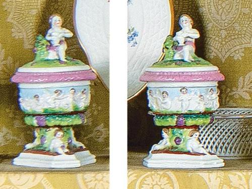Lote 414: Pareja de pequeñas cráteras en porcelana de Capodimonte con escena de Baco niño y bacanal.