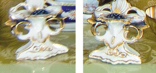 Lote 418: Pareja de violeteros con motivos florales en porcelana esmaltada en blanco y azul. Faltas en uno de ellos.