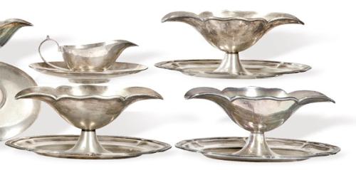 Lote 462: Cuatro salseras de alpaca con bandeja de borde ondulado