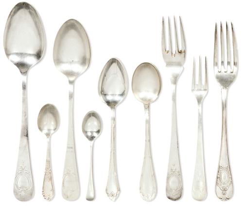 Incluye: 12 tenedores de postre, 13 cucharas postre, 7 cucharillas de moca, 4 cucharillas de café, 2 cucharillas helado, 11 tenedores de pescado, 11 tenedores de cadete, 4 cucharas de cadete y 8 cucharas de sopa.
